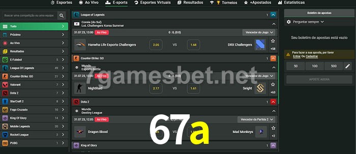 O 67a oferece uma grande seleção de opções de apostas em e-sports com probabilidades competitivas